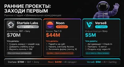 ⚡️ Новые ранние проекты с активностями: Startale, Noon и Verse8 Свежая подборка новых проектов, в которые можно заходить уже сейчас на самой ранней стадии На этот раз в списке: 🔴 Startale Labs - с