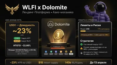 ⭐️ WLFI x Dolomite: запуск лендинга и промо по USD1 с доходностью до ~23% WLFI в партнерстве с Dolomite запустили собственную лендинг-платформу по механике в стиле Aave Доступны базовые активы USD