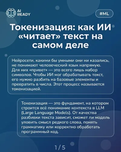🤖 Токенизация: как ИИ «читает» текст на самом деле! Нейросети не понимают слова так, как мы. Для них любой текст — это сначала набор символов, который нужно превратить в понятные машине числа. Проце