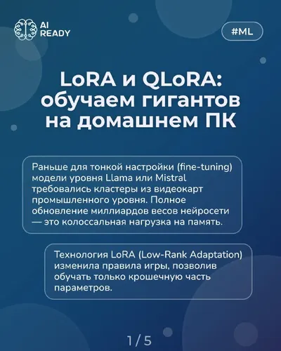 🤖 LoRA и QLoRA: обучаем гигантов на домашнем ПК за копейки! Раньше для дообучения моделей уровня Llama требовались промышленные кластеры видеокарт. Технология LoRA совершила революцию, позволив обно