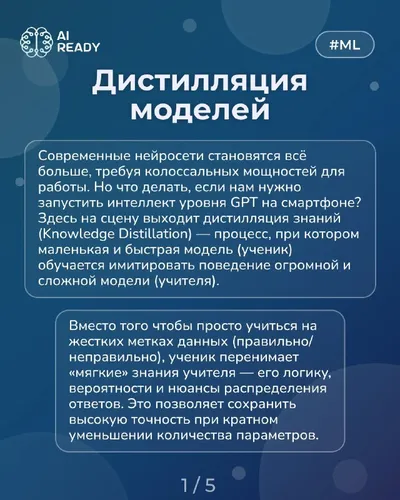 🤖 Дистилляция моделей: как перенести знания из гиганта в «малыша» Современные нейросети становятся всё больше, но запустить их на смартфоне — задача не из легких. Техника дистилляции знаний позволяе