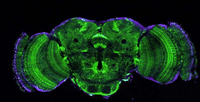 Мозг дрозофилы Обновляем нашу рубрику «Картинка дня». Снова вернемся к конкурсу NeuroArt, на котором мы видим мозг дрозофилы, окрашенный двумя способами. Глутаматергические нейроны, а точнее — их мем