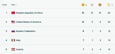Россия на 3-м месте в медальном зачёте Паралимпиады И это команда из 6 человек! 1. Китай: 15 – 13 – 15 (43) 2. США: 12 – 5 – 6 (23) 3. Россия: 8 – 1 – 3 (12) 4. Италия: 7 – 7 – 2 (16) 5. Австрия: 7
