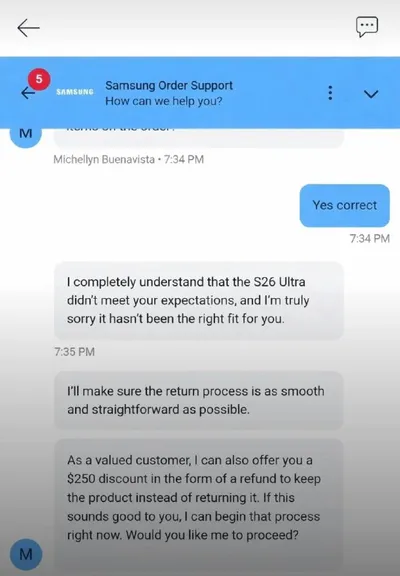 Не понравился S26 Ultra? А может, передумаешь? Поддержка Samsung предлагает компенсацию в 250$, если уважаемый клиент откажется от возврата устройства. В целом звучит неплохо, но такие акции и обесц