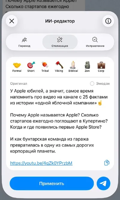 И ныне, по обновлении пути, именуемого Telegram, владыка мой возвестит: «Я буду изречать свои слова лишь сиею манерою». В ТГ добавили редактор текста, если что 😁 Пишем текст и появляется иконка Ai.