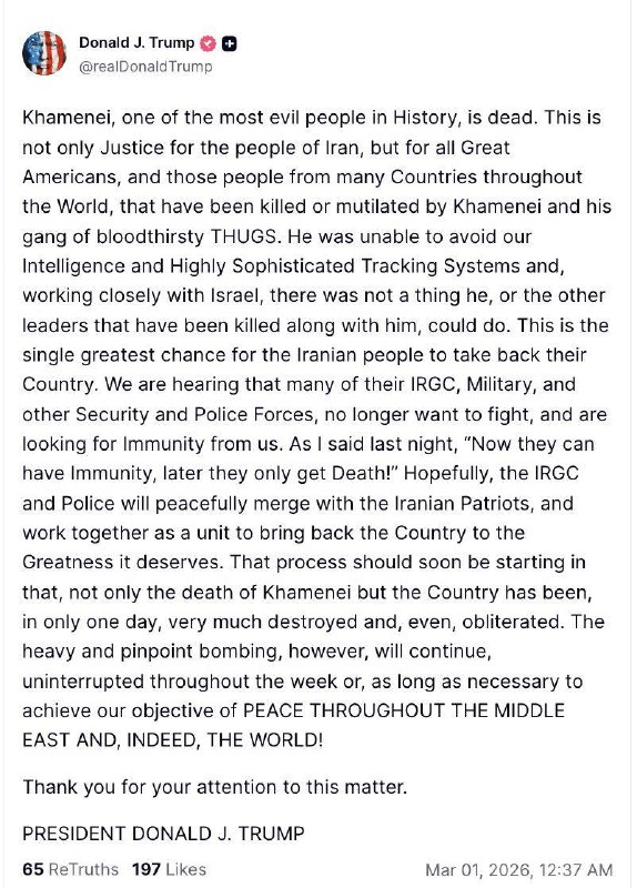 ⚡️ Дональд Трамп сообщил о гибели верховного лидера Ирана Али Хаменеи. @nexta_live