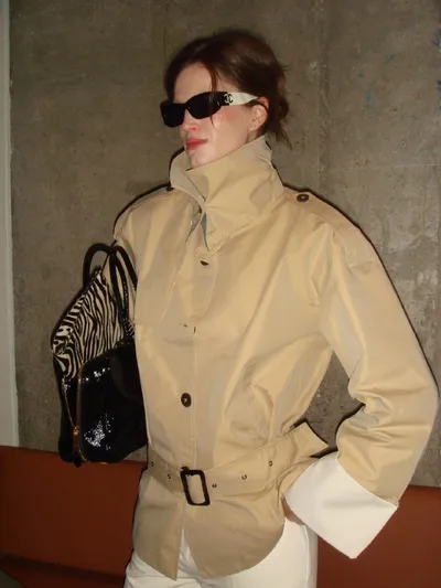 Наш укороченный тренч построен на идее заниженной линии талии: расслабленной, чуть смещённой, намеренно неидеальной. Он не подчеркивает фигуру напрямую, а создаёт силуэт. Свободный, уверенный и актуа