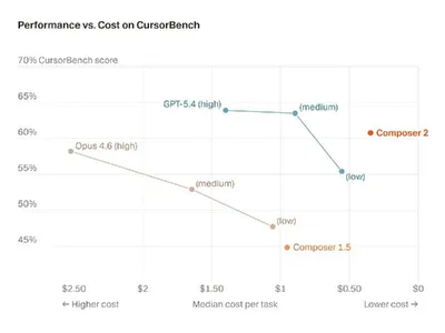 Привет, друзья! Cursor представили Composer 2 — новую флагманскую модель для разработчиков. Модель генерирует код практически на уровне GPT-5.4 в режиме high, но её стоимость в три раза ниже. В тесте