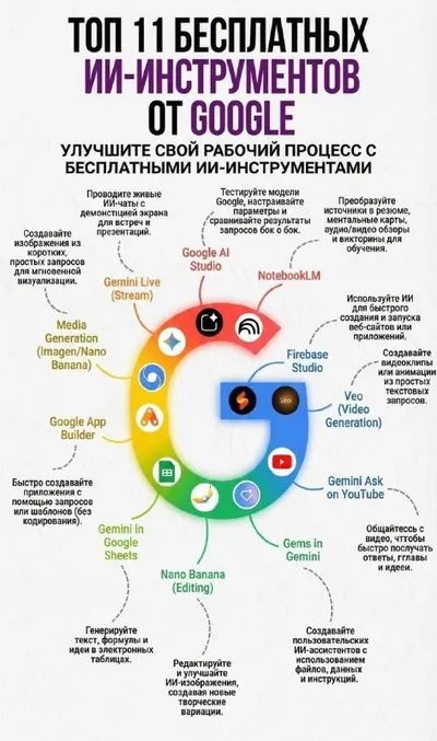 Привет, друзья! ТОП-11 бесплатных нейросетей от Google Google активно расширяет свою экосистему ИИ-инструментов. В одной инфографике собраны главные сервисы для работы, учебы и творчества, которые до