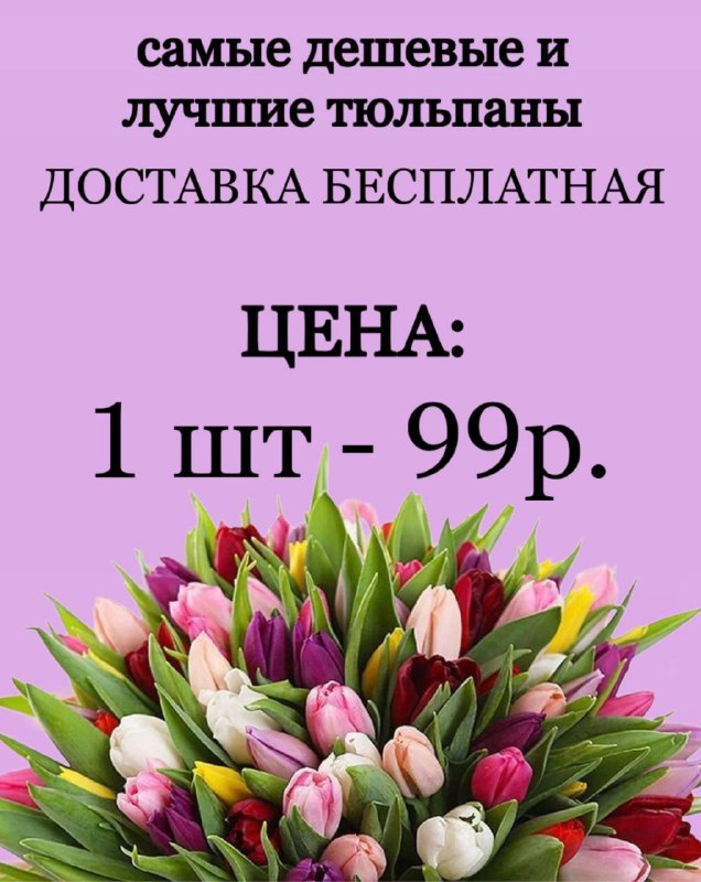 🌷 Супер предложение на тюльпаны! 🌷 У нас вы можете приобрести великолепные тюльпаны всего за 99₽! 🎉 Это лучшее предложение, которое вы не найдете нигде! 🚚 Бесплатная доставка каждый день вплоть