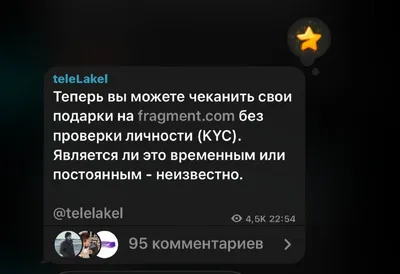 Теперь на Fragment можно минтить подарки без необходимости подтверждения личности (KYC)! 😁 ❤️ - заебись 🤔 - без разницы @AURORA