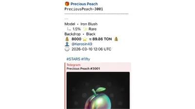 Персик за 8 000 Stars 🤯 Сегодня один из пользователей улучшил Precious Peach, и ему выпал 🎁 Iron Blush на чёрном фоне — с флором 1 400 TON (≈ 1 873 $). 🚽 Но он не растерялся и принял оффер в 8 00