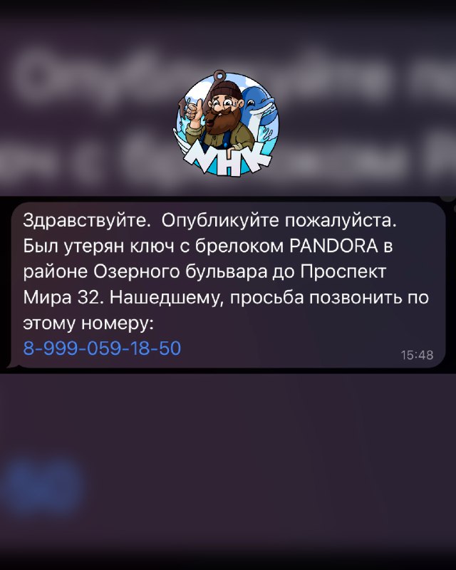 Здравствуйте. Опубликуйте пожалуйста. Был утерян ключ с брелоком PANDORA в районе Озерного бульвара до Проспект Мира 32. Нашедшему, просьба позвонить по этому номеру: 8-999-059-18-50