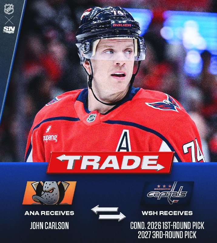 ❗️🦅 «Вашингтон» обменял Джона Карлсона в «Анахайм» на два драфт-пика (условный 1-й раунд 2026 и 3-й раунд 2027). 🏒 NHL