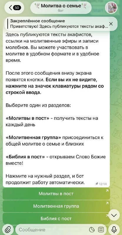 Ловите💌 🙏Молитвы в пост - https://t.me/molitva_o_semie_bot (по кнопкам можно перейти в молитвенную группу, получать анонсы и передавать записки) 📖Библия в пост - https://t.me/nickolaybabkin/8395