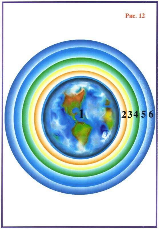 Рис.12 — планета Земля, возникшая в зоне искривления пространства в результате последовательного слияния семи форм материй и представляющая собой шесть материальных сфер разного количественного и каче