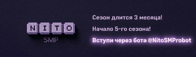 🟪 NitoSMP — Сервер, где нужны люди живёт комфорт 💻 Сервер команды Nitokin - Да, мы старались! ⛔️ Без доната - Мы за равноправие между игроками 📂 Сервер в Нидерландах - Платный хостинг обеспечит иг