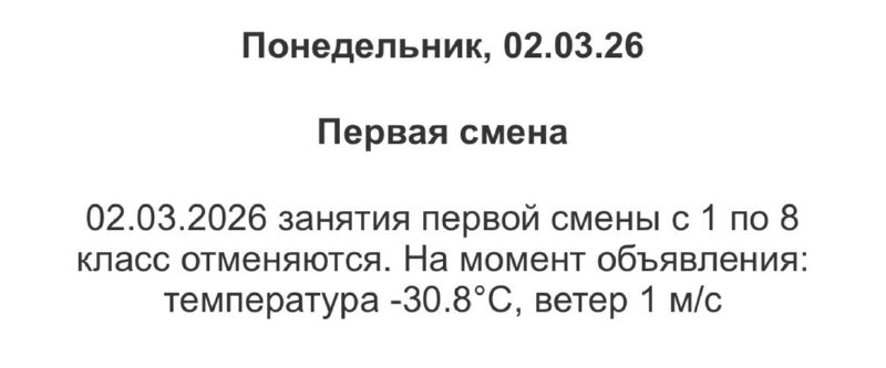Здравствуйте, а что происходит с администрацией города? Почему измеряют температуру в 5:00???? На улице -32, по ощущениям -34, актировку поставили с 1-8 класс. Прислать новость - @chp_86 Подписатьс