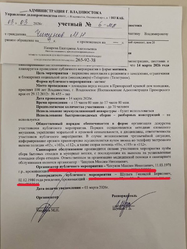 📢 Во Владивостоке планируют митинг против блокировки Telegram. В Владивосток активисты подали уведомление в администрацию о проведении акции против замедления и возможной блокировки мессенджера Tele