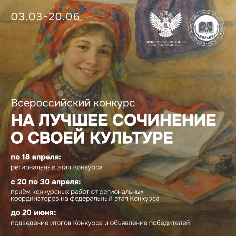 Стартовал Всероссийский конкурс на лучшее сочинение о своей культуре на русском языке и лучшее описание русской культуры на родном языке — 2026 Конкурс проводится Федеральным институтом родных языков