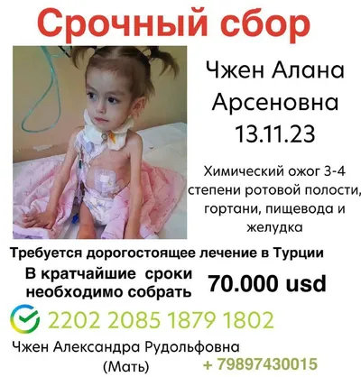 Срочный сбор на лечение ребенка. Чжен Алана Арсеновна Дата рождения: 13. 11. 2023. Диагноз: химический ожог 3-4 степени ротовой полости, гортани, пищевода и желудка. Требуется срочное лечение в Турци