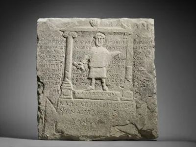 Погребальный камень с обвинением в убийстве и адюльтере. Надпись на нём — обращение покойника к прохожим от первого лица на греческом языке: Прохожий, Афродисий моё имя; я гражданин Троады и корифей