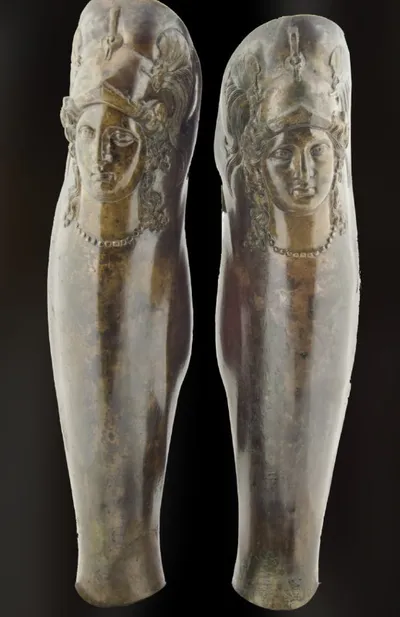 Царские поножи. На них изображена голова Афины в аттическом шлеме. Найдена в гробнице фракийского царя Севта III. А вот изваяние головы царя оттуда же. Объект находится в историческом музее Искра