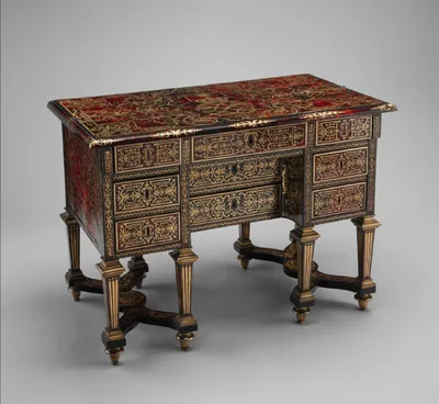 Письменный стол Людовика XIV. Был заказан для Версаля. Объект находится в Метрополитен музее. Больше фотографий можно посмотреть там. Материалы: Дуб, сосна, орех, чёрное дерево, палисандр, панцирь