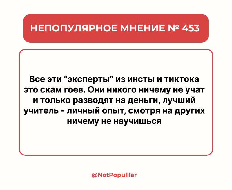 ОбразованиеМы слушаем и не осуждаем #F99FG Авторский проект "Непопулярное мнение" Реклама - @dyttell Написать свое мнение - @Mneniiyebot через биржу: https://telega.in/c/NotPopulllar РКН: https://clck.ru/3PmJcc