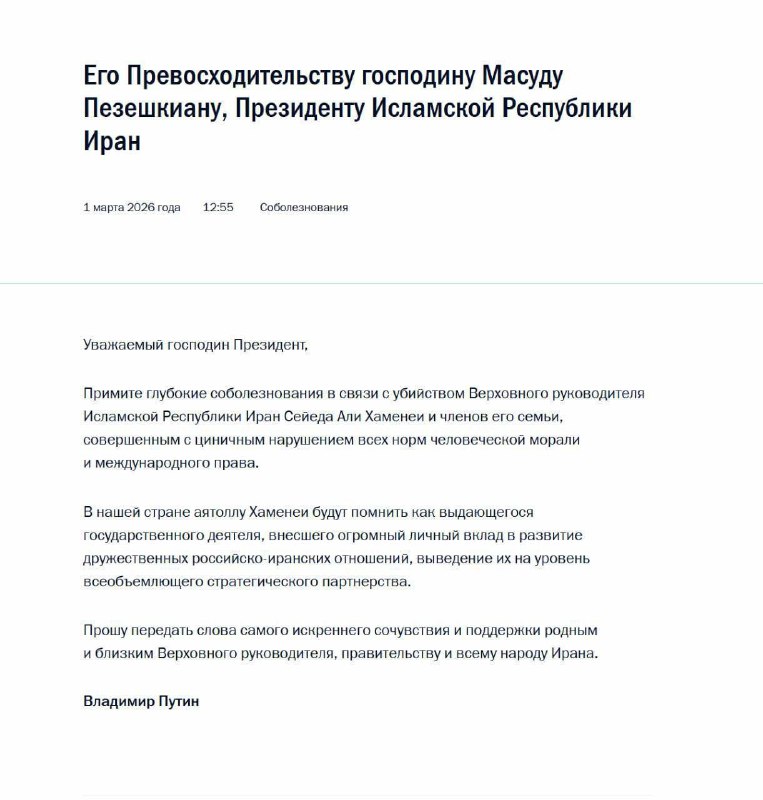 ❗️Владимир Путин выразил соболезнования Пезешкиану в связи с убийством верховного руководителя Исламской Республики Иран Сейеда Али Хаменеи Президент России охарактеризовал гибель аятоллы Хаменеи ка