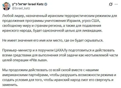 ⚡️Любой новый лидер Ирана станет «безоговорочной целью для ликвидации», — министр обороны Израиля Кац.