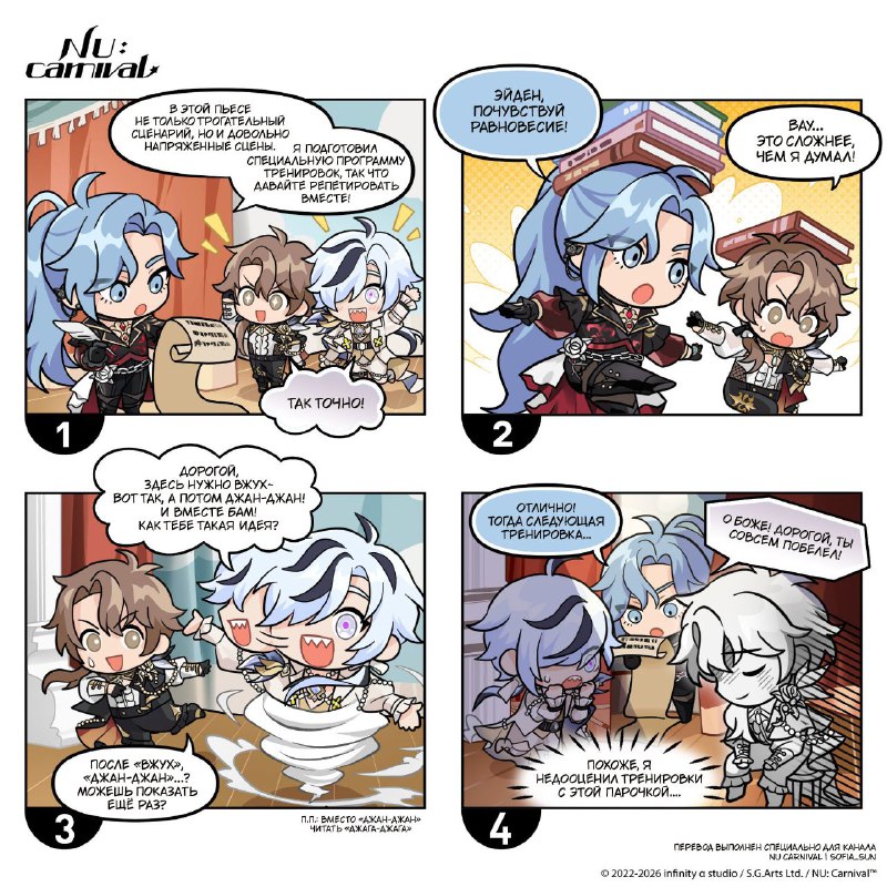 RUS Спасибо @tama_kororo за иллюстрацию к 4-й годовщине NU: Carnival! Мастера Эйден, Гарy и Рей всё подготовили! Большой торт приносит особые благословения Мастерам в этот радостный день 🎂 🎁 5AZB
