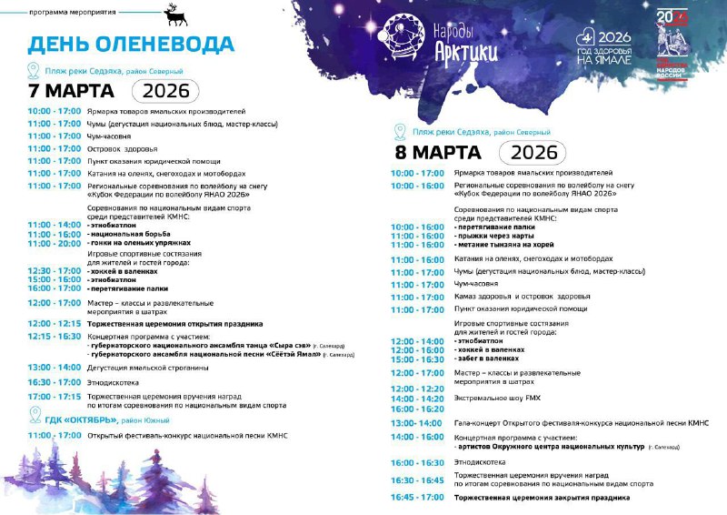 🦌 Сохраняем: программа мероприятий на День оленевода Изучите афишу — в ней всё о спортивных и развлекательных мероприятиях на два праздничных дня. #НародыАрктики Пересылайте пост друзьям, коллегам