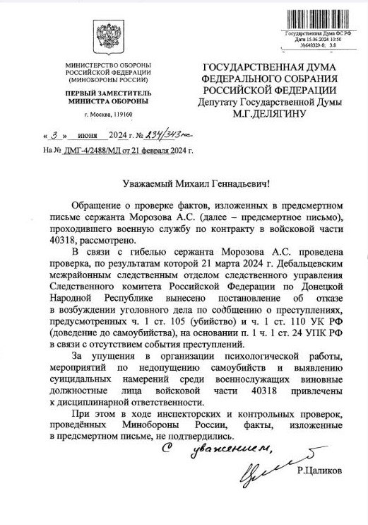 Ответ на запрос о доведении до самоубийства сержанта ВС РФ Андрея Морозова, позывной Мурз НотаБе Подмахнул эту отписку тот самый Цаликов, которого не так давно сняли с должности министра обороны. На