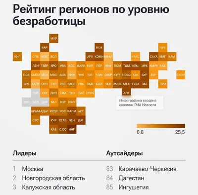 👷 В Москве самый низкий уровень безработицы — всего 0,8% Также в ТОП-3 вошли Новгородская и Калужская области. Самый высокий уровень — в Карачаево-Черкесии, Дагестане и Ингушетии.