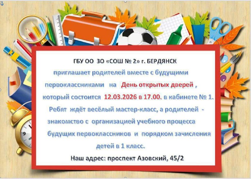 ❗️СОШ №2 г. Бердянска открывает набор учащихся в 1-й класс на 2026-2027 учебный год 📁График приема документов понедельник — пятница: с 09:00 до 15:00 СОШ №2 расположена по адресу: 📍г. Бердянск, п