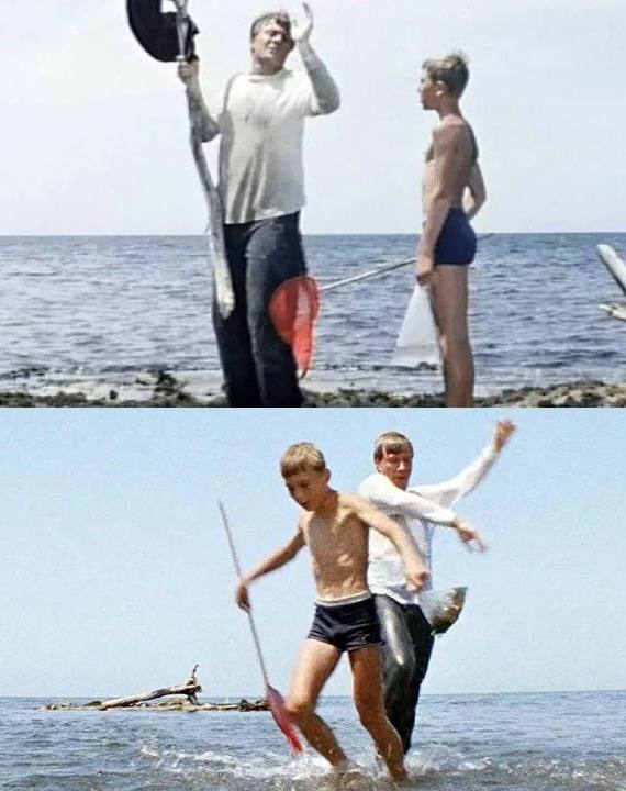 Известный эпизод с мальчиком, которого пинком отправляет в воду герой Андрея Миронова в фильме «Бриллиантовая рука», сыграл Максим Никулин, сын Юрия Никулина. Съёмки шли трудно - юный актёр инстинкти