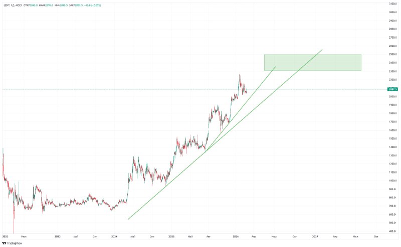 С 20 марта акции Ленты будут включены в Индекс МосБиржи. Для акций - это очень хорошо ♥️ А что по техническому анализу? 🔵 С середины 2024 года акции уверенно растут. 🔵 Линия тренда (зеленая линия)