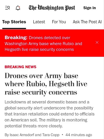 Над военной базой Форт-Макнейр в Вашингтоне, где сейчас в целях безопасности проживают госсекретарь США Марко Рубио и министр войны Пит Хегсет, несколько дней летают неопознанные дроны Беспилотники ф