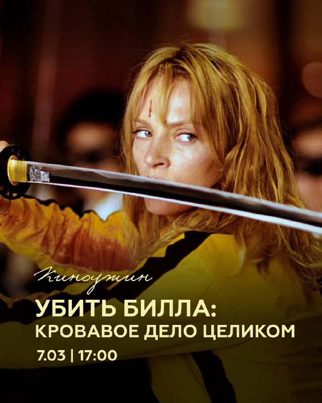 КИНОУЖИН «Убить Билла: Кровавое дело целиком» | 07.03 | 17:00 Специальный показ! Смотрим режиссёрскую сборку «Убить Билла», где Ума Турман за один фильм яростно расправляется со всеми злодеями. Билл