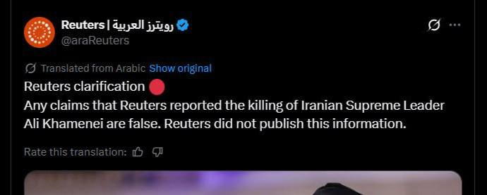 Reuters отрицает сообщение о смерти Имама Хаменеи, опровергнув сионистскую пропаганду Прислать новость || Подписаться