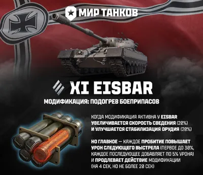 🛎🛎🛎🛎 Eisbär XI уровня: немецкий тяжёлый танк, спокойный внешне, вспыльчивый на поле боя. 🗞 Подогрев боеприпасов: Модификация EisbАr увеличивает скорость сведения (20%) и улучшает стабилизацию ор