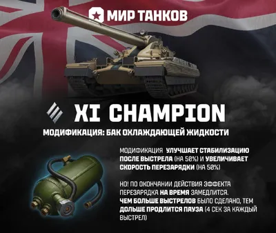 🛎🛎🛎🛎 Champion: британский тяжёлый танк XI уровня с характером чемпиона! ❄️ Бак охлаждающей жидкости: Модификация улучшает стабилизацию после выстрела (на 50%) и увеличивает скорость перезарядки