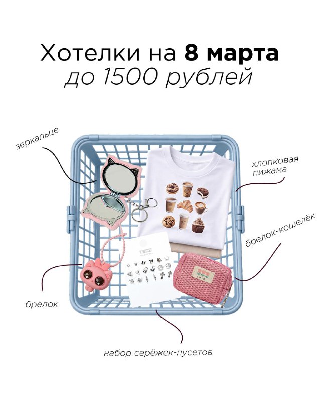 Собрали список твоих хотелок на 8 марта 🌼 Пересылай пост своему масику — как намёк ➡️ набор серёжек-пусетов ➡️ хлопковая пижама с принтом ➡️ антистресс кошечка пучеглазик ➡️ брелок-кошелёк ➡️ пуш