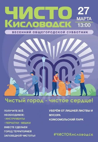 Уважаемые жители и гости города-курорта! В Кисловодске начинается череда городских субботников. Первый субботник в этом году пройдет 27 марта в 13:00 на территории Комсомольского парка. Субботник