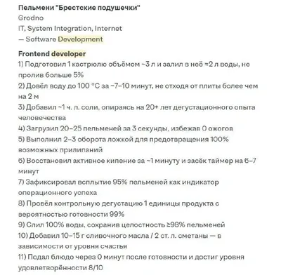 Анекдот дня: айтишник взял и вписал в идеальное резюме рецепт пельменей вместо опыта работы. И его позвали на собеседование! ИИ отобрал резюме за красивое оформление и «нужные» навыки. А человек-рекру