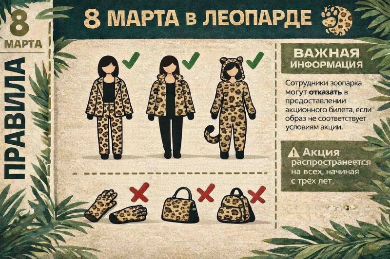 😂 8 марта Московский зоопарк пустит всех девушек в леопардовом образе за полцены. Подойдут либо костюм леопарда, либо два элемента с леопардовым принтом. 🔥 Москва не спит