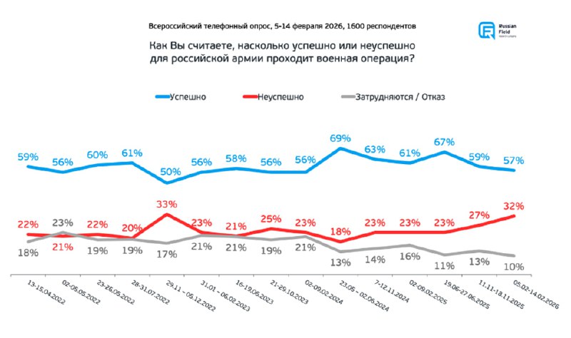Оценки хода СВО и перспектив мирных переговоров 🔹 57% россиян считают, что СВО проходит успешно для российской армии, 32% ответили, что неуспешно. ✔️ Доля негативных оценок возросла и почти достигл