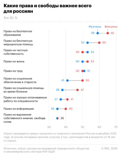 Самые важные права для россиян: 1️⃣ право на бесплатное образование (62%) 2️⃣ право на бесплатную медицинскую помощь (57%) 3️⃣ право на частную собственность (52%) 4️⃣ право на жизнь (52%) 5️⃣ прав