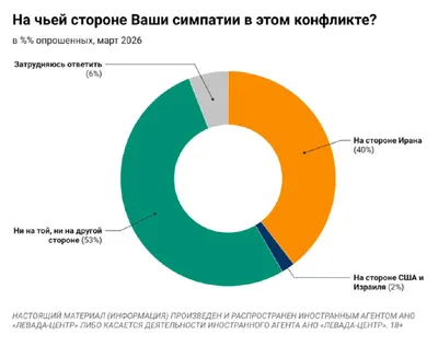 40% россиян болеют за Иран 2% на стороне США и Израиля 53% сохраняют нейтралитет 📊 Опросы и замеры, опрос Левада-центра (признан иноагентом)